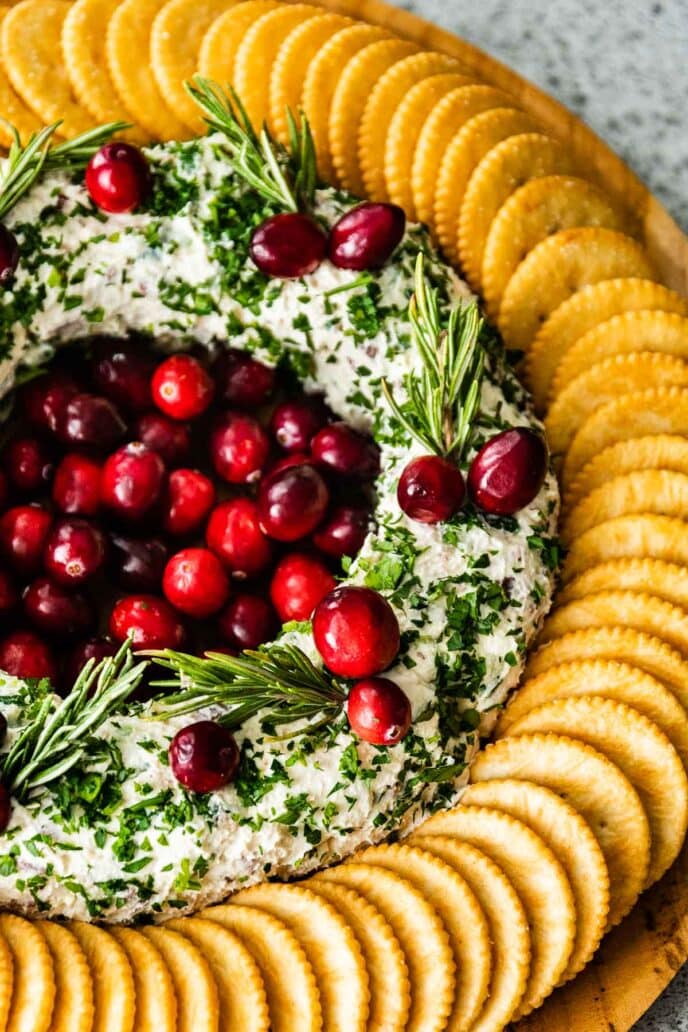 A festive, edible centerpiece decked out with almonds, herbs, and holiday cheer. It’s the only wreath you’ll want to tear into with crackers instead of hanging on your door!